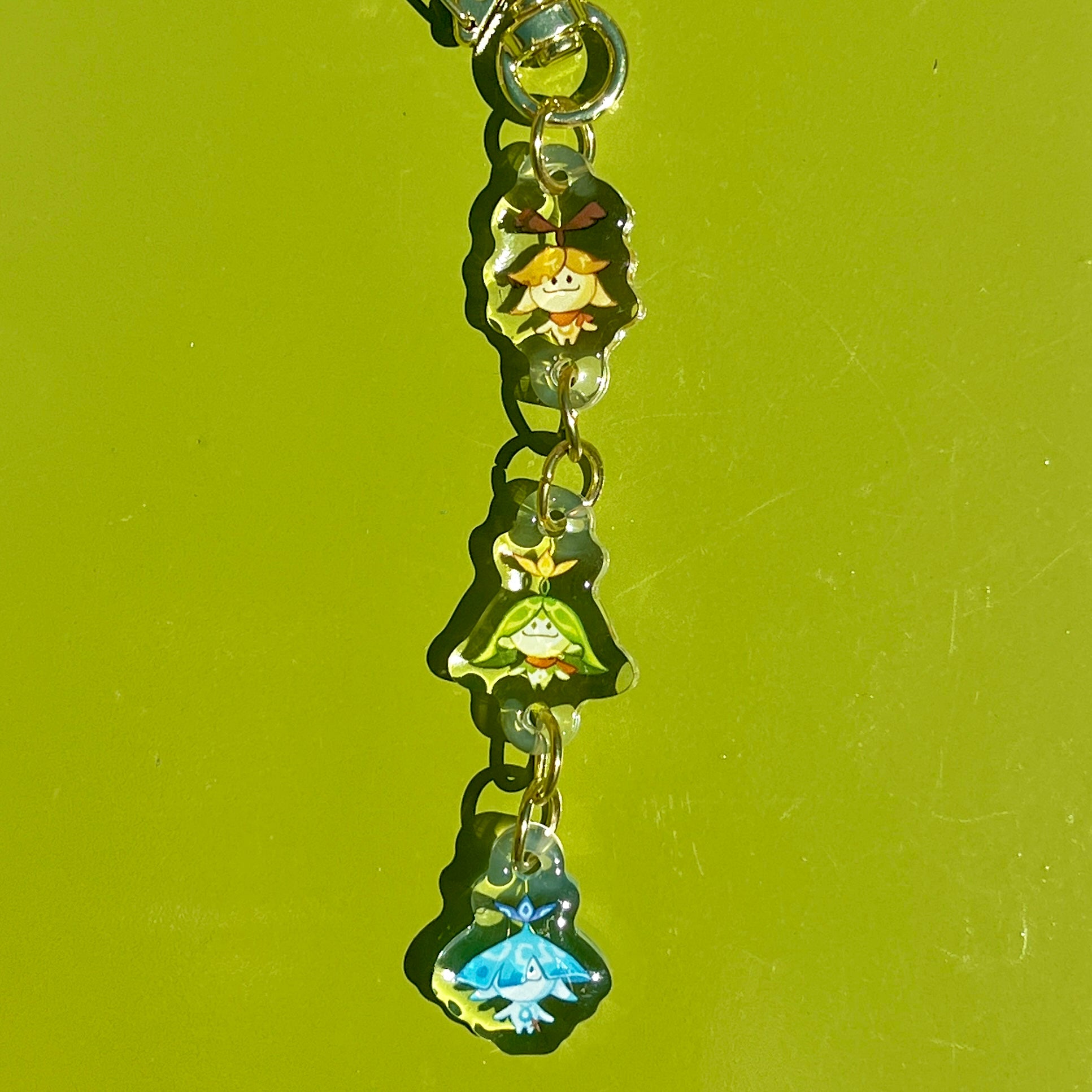 teeny tiny aranara (aranimba, arana, ararycan) linked together on a double-sided epoxy keychain with a gold heart clasp.