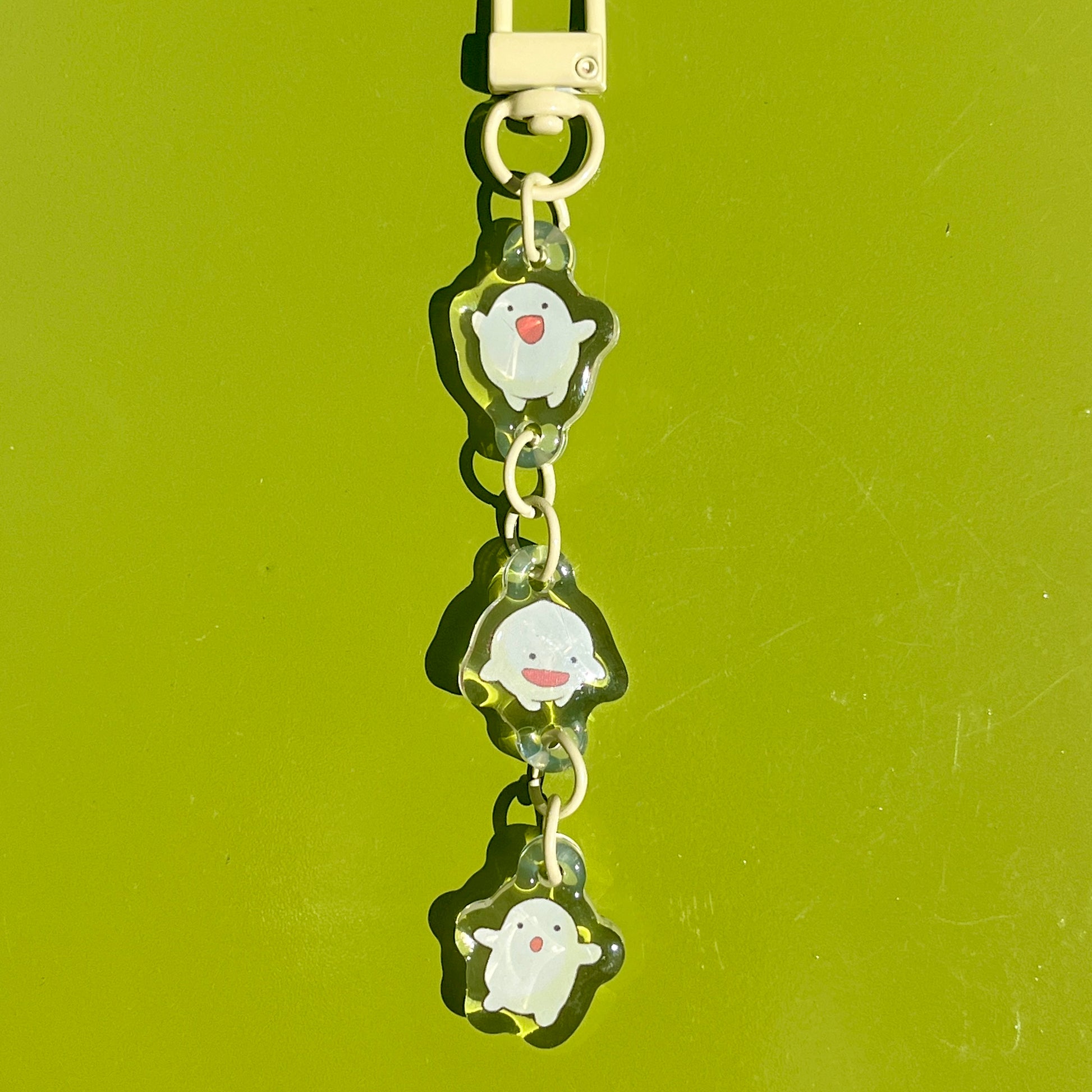 double-sided epoxy keychain of warawara from the boy and the heron with a beige clasp.